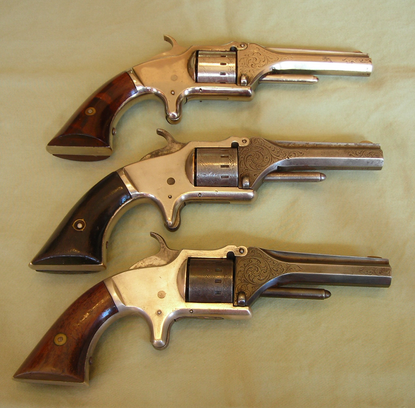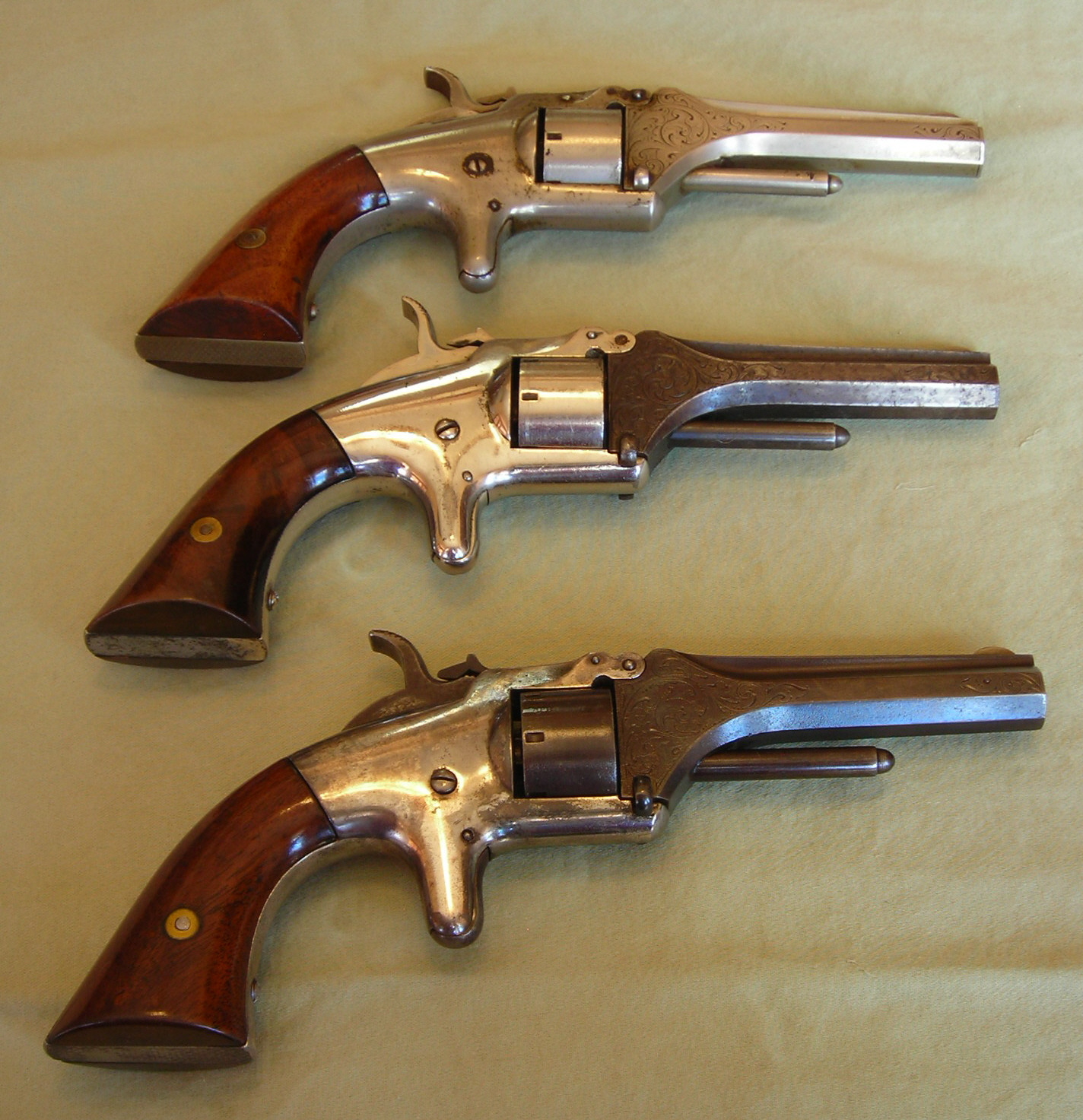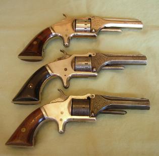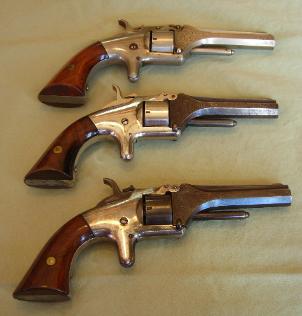 | Second model .22's Top: full nickel Middle: nickeled frame and blued cylinder Bottom: silver plated frame w/blued cylinder |
