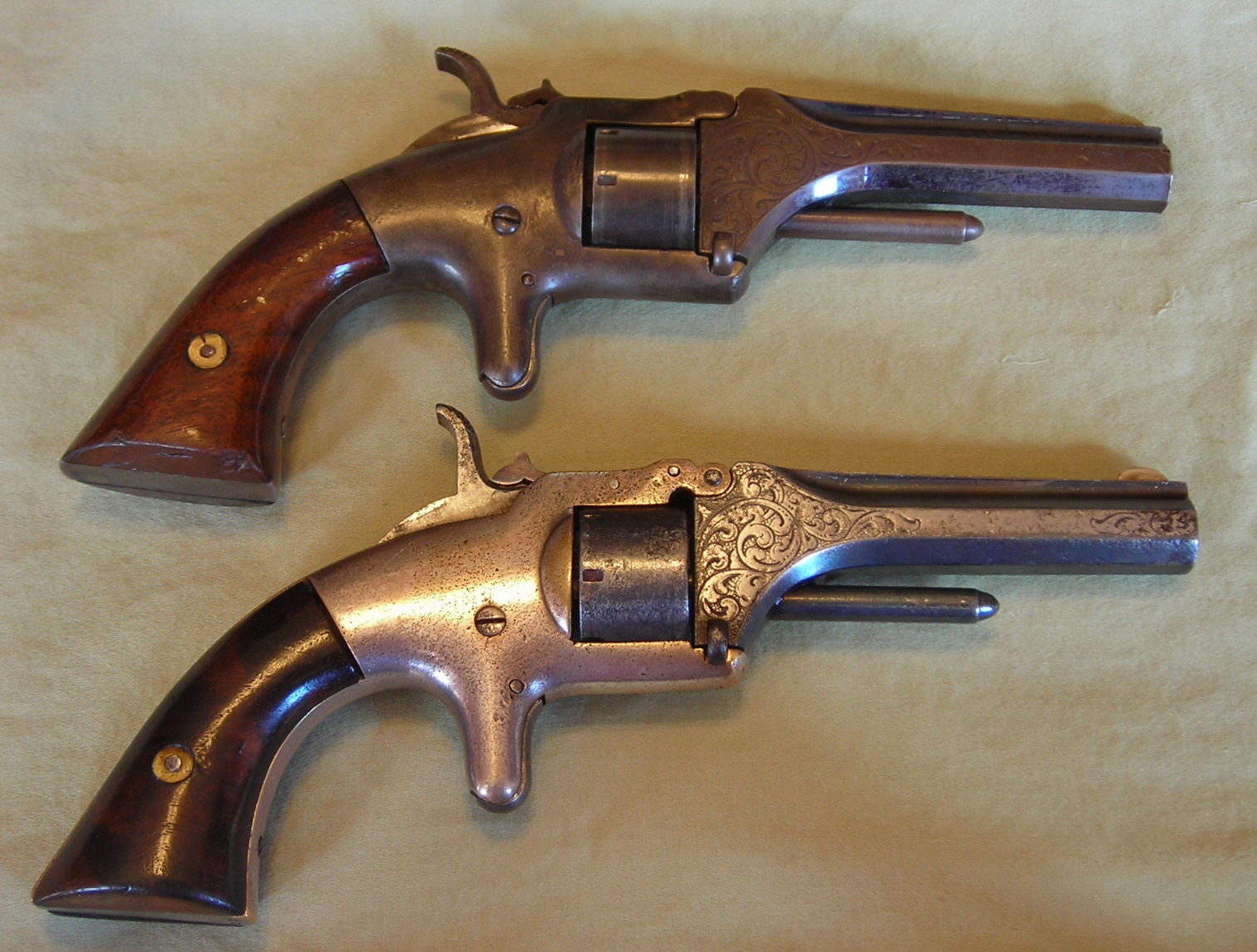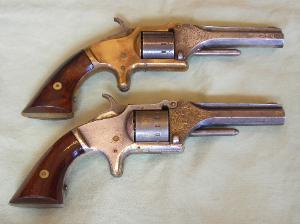 | Second model .22's Top: gold plated frame Bottom: silver plated frame with gold washed barrel and cylinder |