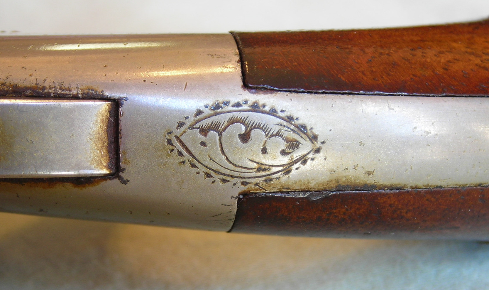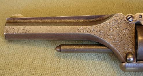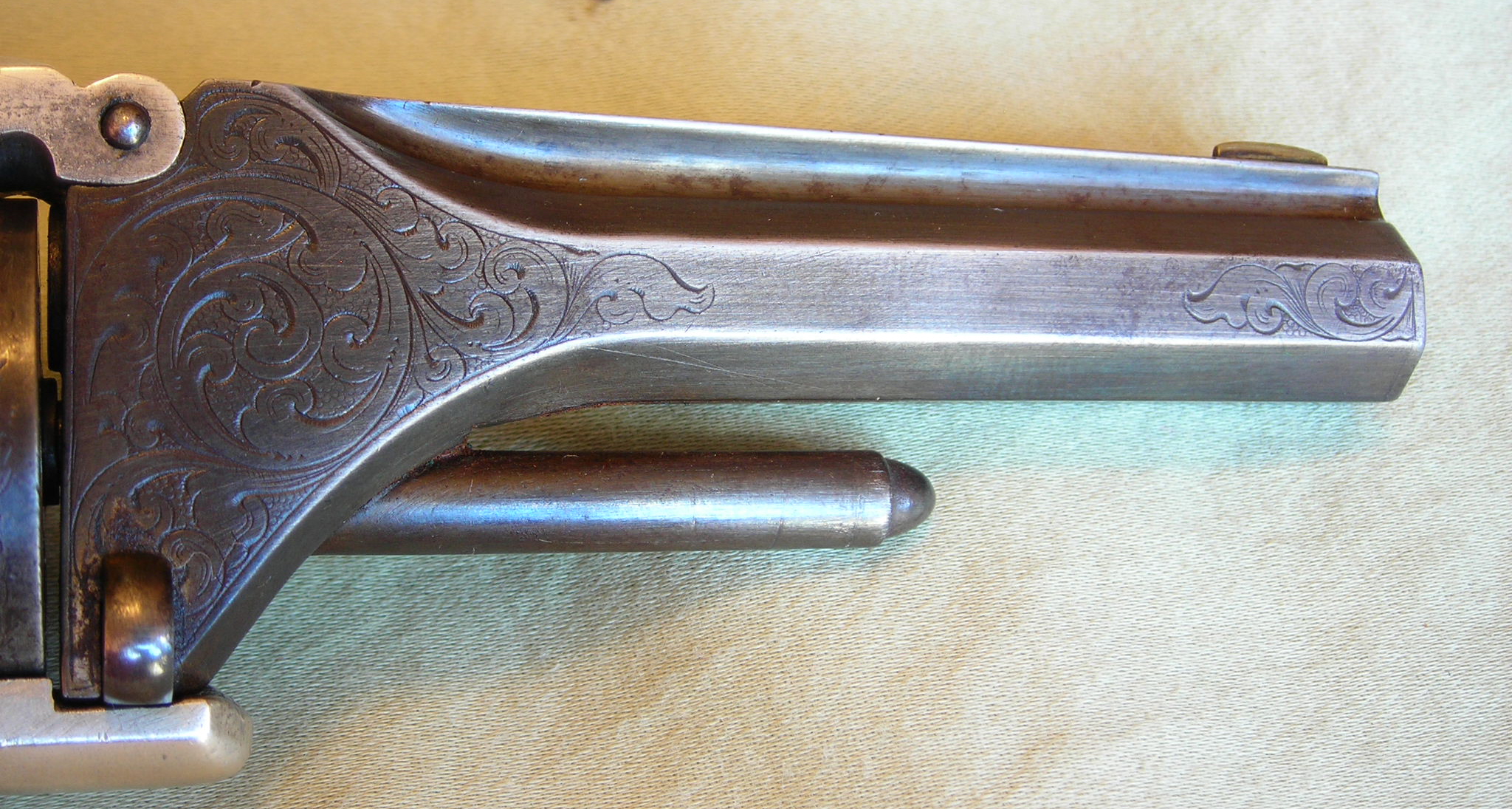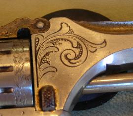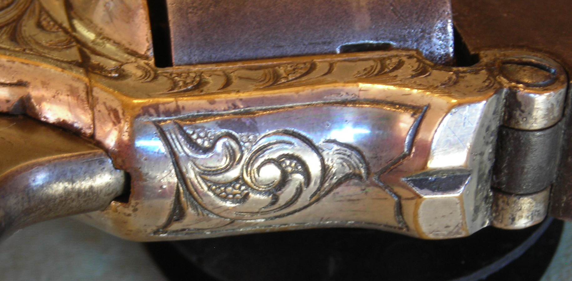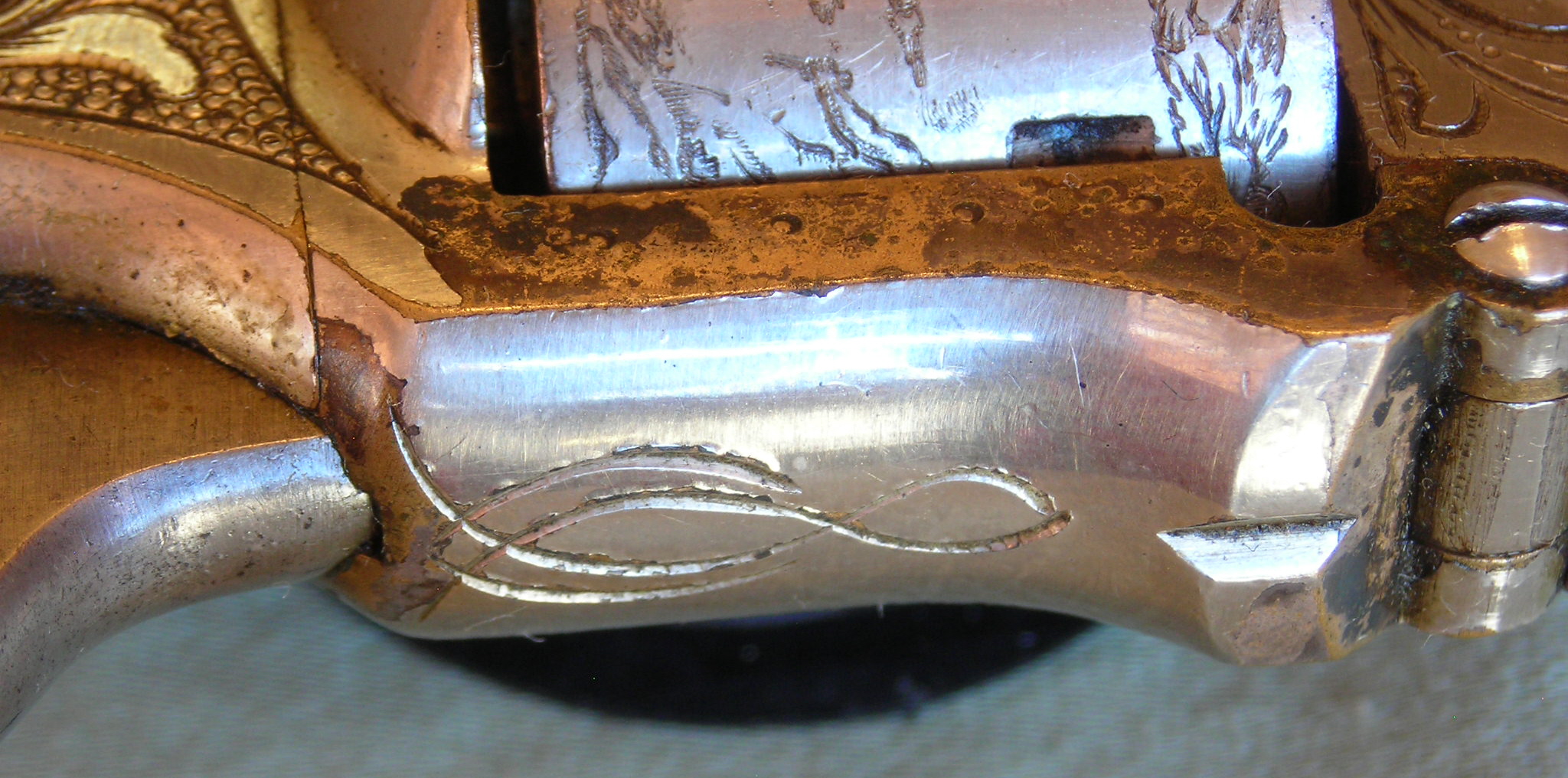 | Rarer crosshatching frame engraving is also used on engraved Second Models. Note the original polished brass frame. |