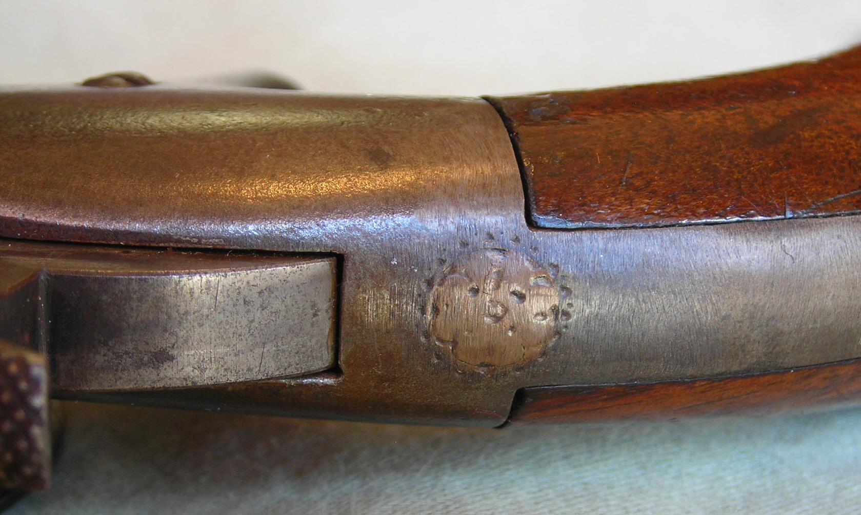 | Brass and copper plugs are common (look close!). Because the plating is worn you can see a square plug on the right of the bottom butt strap. |