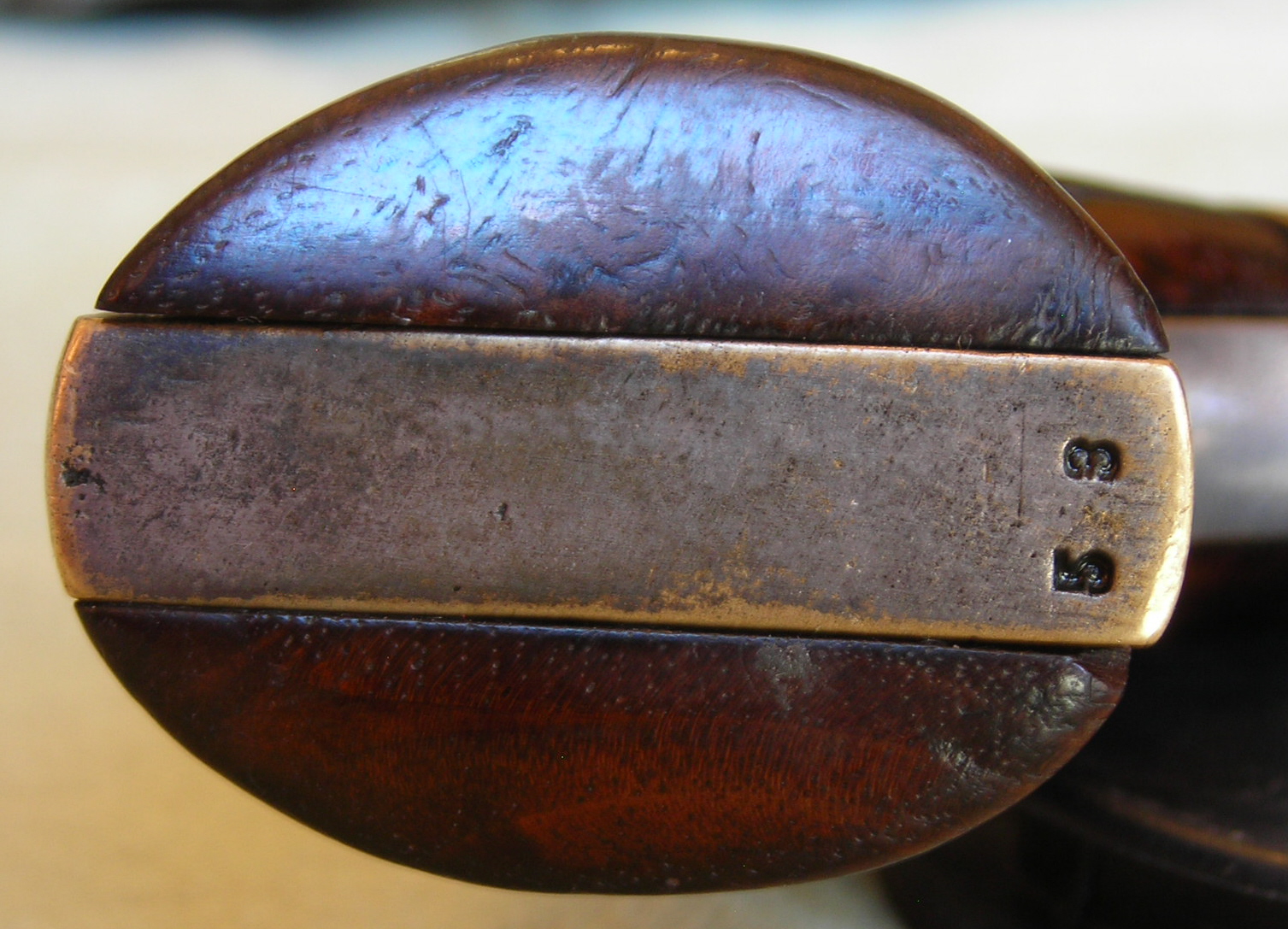 | On some very early first model first variation .22's the serial number is stamped on the butt strap. This is Serial number #53 |