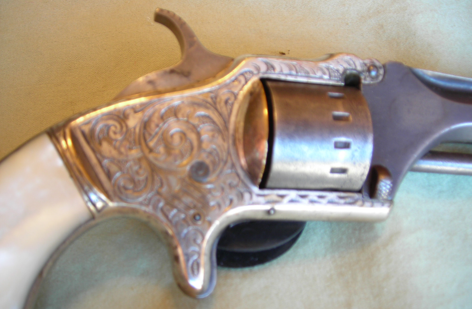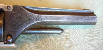 | Engraved barrels on the Second model are not standard, but not very rare either. Maybe half of all Second model .22's have some engraving. There are two main styles of engraving. The most common is the floral engraving seen on the barrels and then sometimes carried over to the frame. A second style has a crosshatched design on the frame. But even the common floral design has many variations from gun to gun. I hope these photos help!!! |