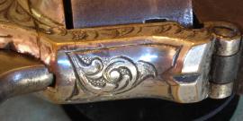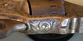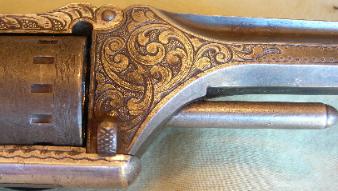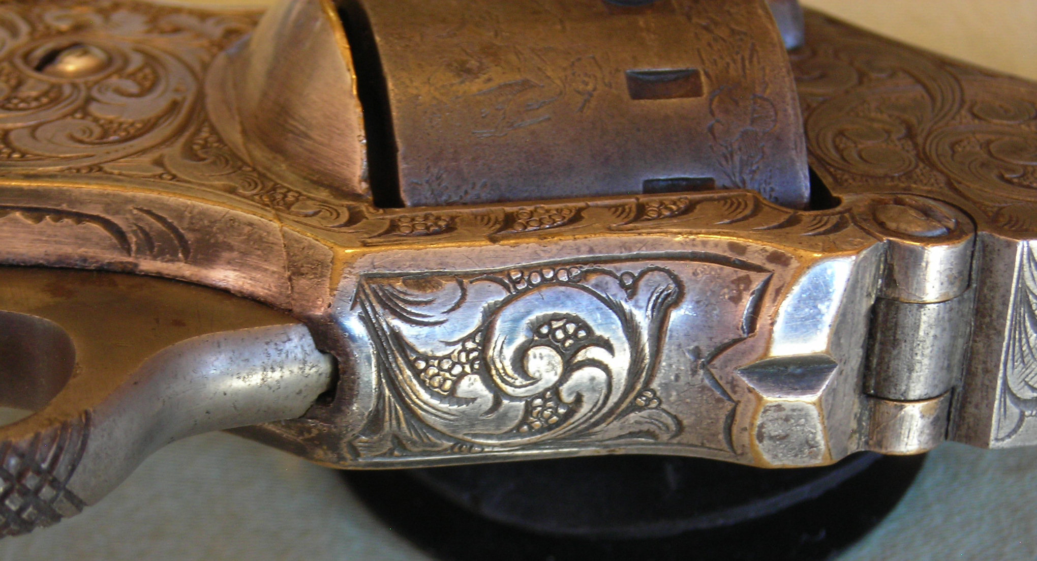 | Close-up of gold wash showing in protected areas on the barrel engraving and on the cylinder scene |