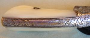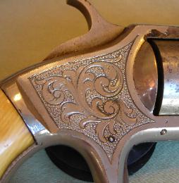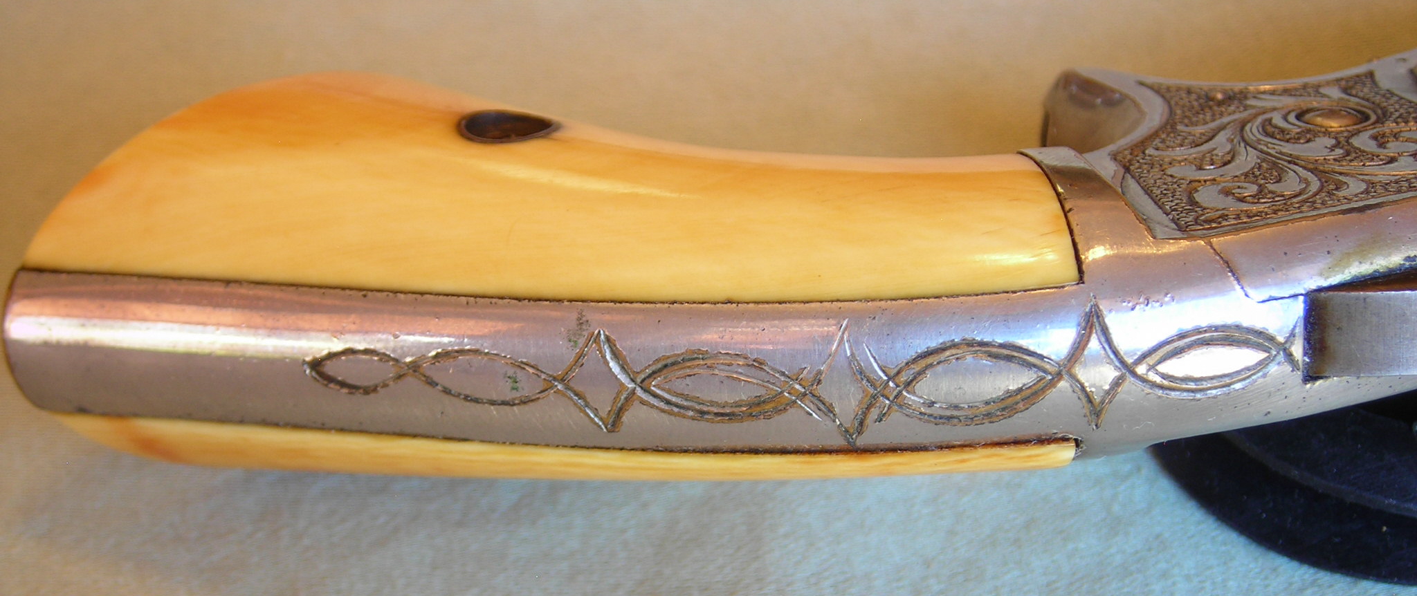 | Engraved barrels on the first model are standard. I have never seen an engraved first model frame. Unique to the first model are casting imperfections on the back and bottom of the backstrap. These were plugged with brass or copper, then engraved to camouflage the plug. The plugs were then plated over and hidden. I get asked quite often about these plugs. The bottom of the grip is sometimes roll engraved in a checkering pattern to hide imperfections. |