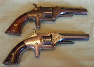 | First model .22's Top: Silver frame tarnished black Bottom: nickeled frame, blue cylinder This bottom revolver is the most common configuration |