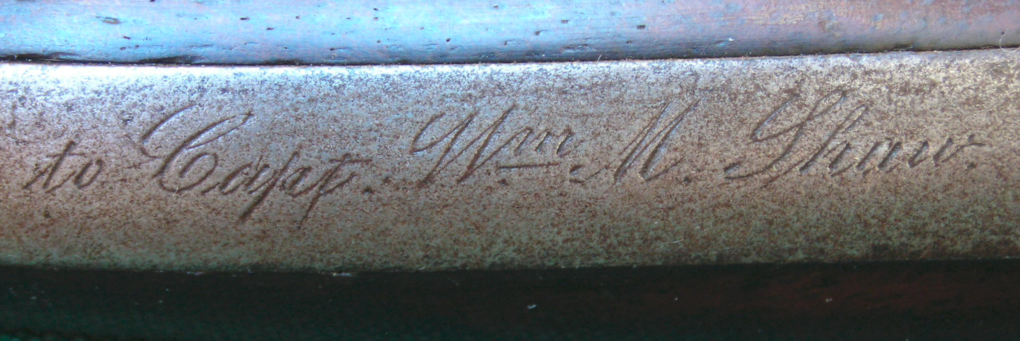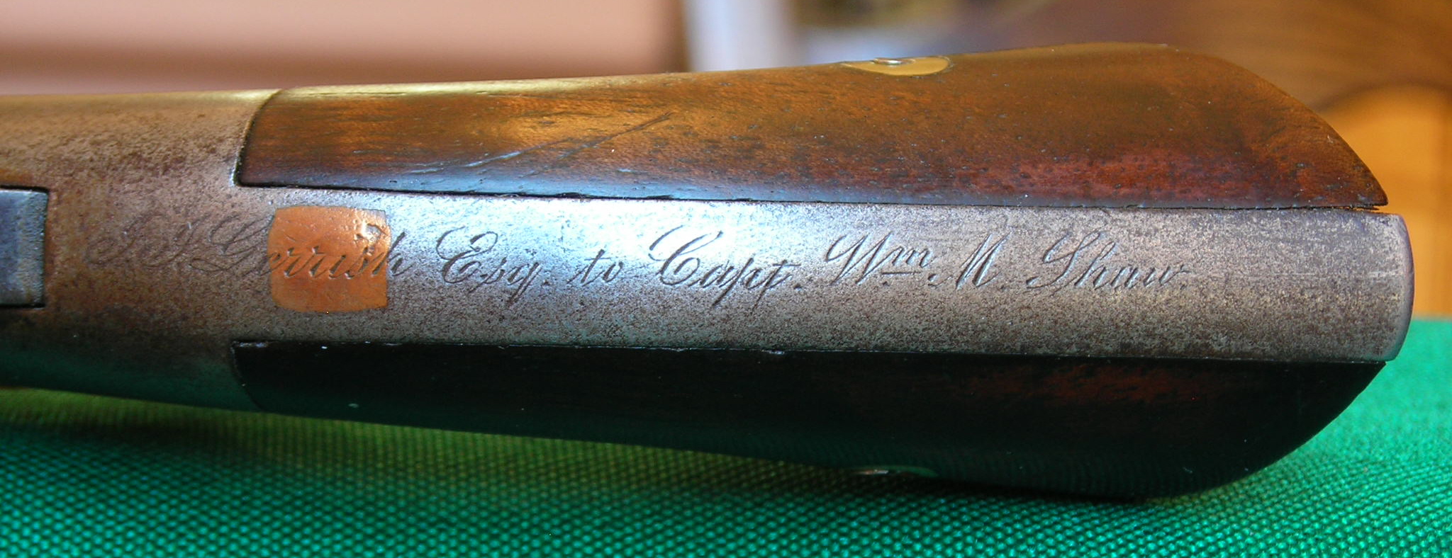 “A Manhattan Story” Inscribed Manhattan First Model .22 Revolver To me, every gun in my collection has a story. Some short, some long, but all have a memory that together is the “story” of my collection. A Manhattan that comes with a great story, or currently belongs to someone really special, can become a special part of my life. Those who know me personally know that my interest in Manhattan Firearms started because of my love for American history. I was always with the history nuts at the gun shows instead of with the gun nuts. (…note that we are all nuts! Haha!) Recently, one of these special Manhattans jumped up and hit me square in the face. A short note came to me from my website that said… name = Terry email = joyride@ZZZZ.com comments = I have one of these,,,,Model: First Model Cartridge, Fourth Variation Caliber: .22 Caliber Barrel Length(s): 3" Serial Number Range: approx. 7,000+ to 9,000+ Features: 7-shot, Round frame, copy of S&W First Model .22, Iron Frame, Barrel latch shortened. Manufacturing date: around 1860 to 1861 Pretty much exact as the one in your picture only it is engraved on the back of the handle or butt. It says. J.J.Garrish Esq. to Capt.Wm.M.Shaw Thanks, Terry Inscribed backstrap of Manhattan .22 caliber revolver Serial # 5572 (Note: this is a Third Variation revolver, not a Fourth Variation as was assumed by Terry) Wow! An inscribed Manhattan. With not just one, but two names inscribed!! I have never seen another Manhattan with two inscriptions. Who are these people? What is their place in American history? I need photos, and I need them now! It is a good day to be a Manhattan lover. As I replied to Terry, inscribed Manhattans are 10 times rarer than inscribed Colts. Where did Terry get this gun? How long has he had it? Maybe he can adopt me and leave it to me in his will? The whole thing to me comes down to a nutshell…what is this Manhattan’s “story”? So I wrote Terry and asked for his story. We wrote emails to each other several times a day for the next two months. We talked about our lives, our family, our love lives, places we have been and seen, and how Manhattans played a role in our lives. For Terry, it was all about his dad. Terry bought the Manhattan at an antique shop many years ago for little money because he thought it would look good hanging on his wall. (I have a few hanging on the wall; I understand the feeling.) Terry’s dad died at the young age of 56. In his words, he never knew his dad as an adult. As Terry and I both approach his dad’s age, you have a tendency to reflect on these things. Both of our dads were in the service, and that means a lot to both of us. Terry is so proud of his dad and cherishes the few items he has of his dad’s military life. So Terry decides one day that Captain Wm M. Shaw’s family should have his Manhattan back. In his own way, he thinks of this as a thing to do in honor of his dad. Maybe more, he sees this as a way to honor all of our country’s veterans. Terry has brought this Manhattan’s “story” alive to me. This revolver has become a symbol of both history and honor to fathers. This “story” needs to be told. But now what? A quick internet search shows a dozen Wm. Shaws in the Civil War. Even if you could find the right one, there have been maybe 5 or 6 generations since then. Shaw’s descendants could number in the thousands. I know Terry’s interest is in the serviceman inscribed, but what about J.J. Garrish? Maybe his descendents should have the Manhattan. This adds even more to think about. I assume that the kinfolk of Shaw sold the gun at one point because they didn’t want it. Who the heck are these two guys?? We sent emails to other historians, and Terry went looking for the antique shop owner. Of course, the antique store had closed long ago. Research results were getting nowhere. Terry offered to let me purchase the gun. We talked a long time about this. I wanted him to think about the situation, as this gun meant so much to him. I told him that I would put the gun on my website and share his story with other Manhattan collectors. Meanwhile, we would continue to research this gun and tell its tale. After I received this gun from Terry, it became an obsession of mine to know, as Paul Harvey says, “the rest of the story.” (Our kids need to look up who Paul Harvey was!) Research on William Shaw is going nowhere. I have spent months looking for these two guys. I am convinced one out of every ten soldiers in the Civil War was named William Shaw, not counting the Bill Shaws, the Billy Shaws, and even the Confederates had to have had a few “Billy Bob” Shaws. Heck, everyone in America must have an Uncle Bill Shaw that served in the Civil War in their family tree. The smallest thing can be the key sometimes. Finally two things stood out to me. Under a magnifying glass, I realized that Terry had made a mistake in his emails to me. It was not inscribed “J. J. Garrish”. It was “J.J. Gerrish”. We were searching for the wrong guy. Also, while looking at the gun, I focused on the “Esq.” I assumed this abbreviation was for Esquire, which I knew was either a title of some unknown meaning to me or the name of a magazine. Or it probably was an answer to some crossword puzzle clue. I searched for the term “Esquire” and found out that, today, it is typically used as a title by a lawyer. Then I got to thinking, what did Esquire mean in Civil War times?? I found that Esquire came from the medieval “Squires” who assisted the Knights. Later, Esquire became a title of British nobility, a distinction between upper and lower gentry (Esquires and Gentlemen respectively). So, now the search moves on to J.J. Gerrish. I just need to find a J.J. that is English upper gentry. You can see in this photo that Gerrish is spelled with an “e” (Almost all Manhattan 1st model .22’s have a copper patch somewhere on the backstrap. This is a patch for a flaw from the cas