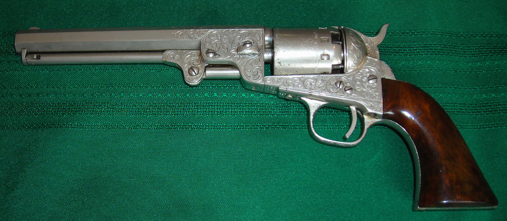 The Manhattan Navy of H. A. McCaleb Col USA ( double-click on the photos for larger pics ) Manhattan Navy SN# 40496 is a Series III Manhattan Navy manufactured circa 1864 and inscribed to Colonel H. A. McCaleb. It is a rare fully engraved factory and nickel plated .36 caliber Navy with a 6 1/2" barrel. There is a fair amount of interesting information available on Col McCaleb and his role in the War between the States. The engraving is the standard factory style and I took a lot of close up photos of the engravings for those that want a detailed look. Make sure you read his obituary article from "The Henry Republic" newspaper. It's gruesome, gossipy, and patriotic all at the same time! First the photos...ooh....aahhh...ooh again! And then more than you want to know about Col. McCaleb...enjoy! |
